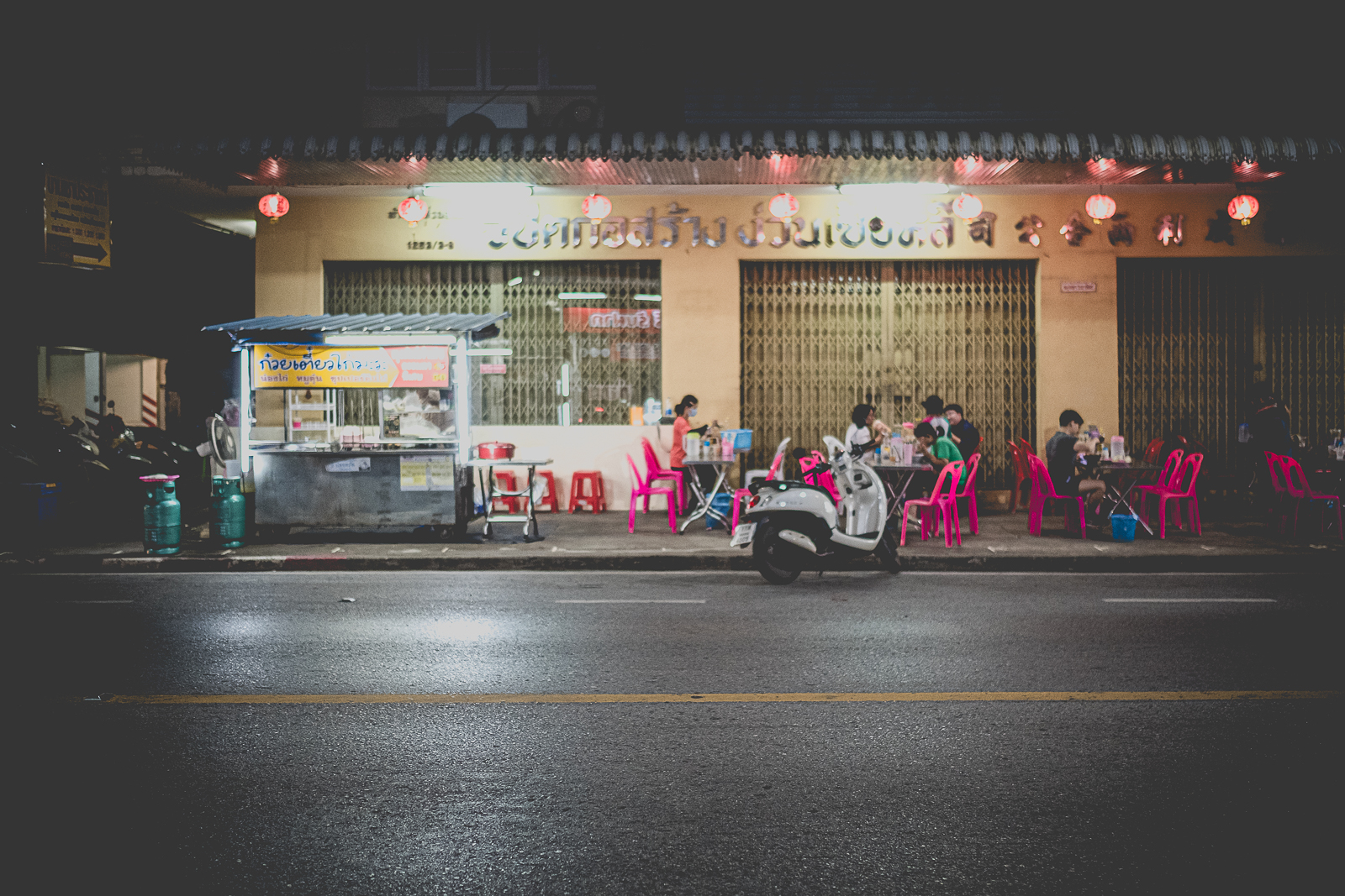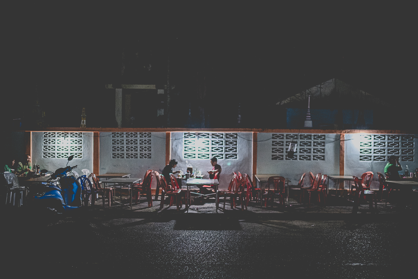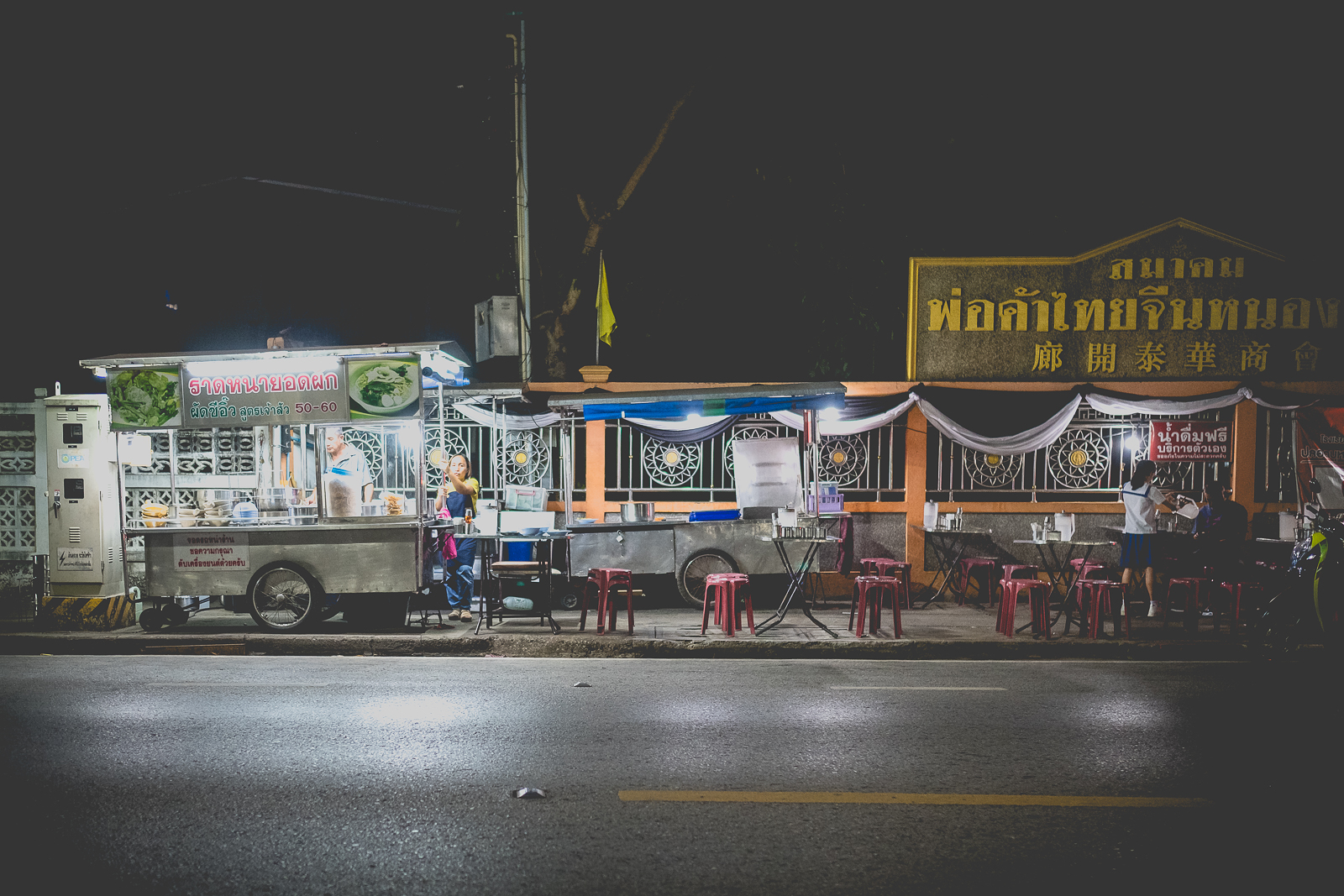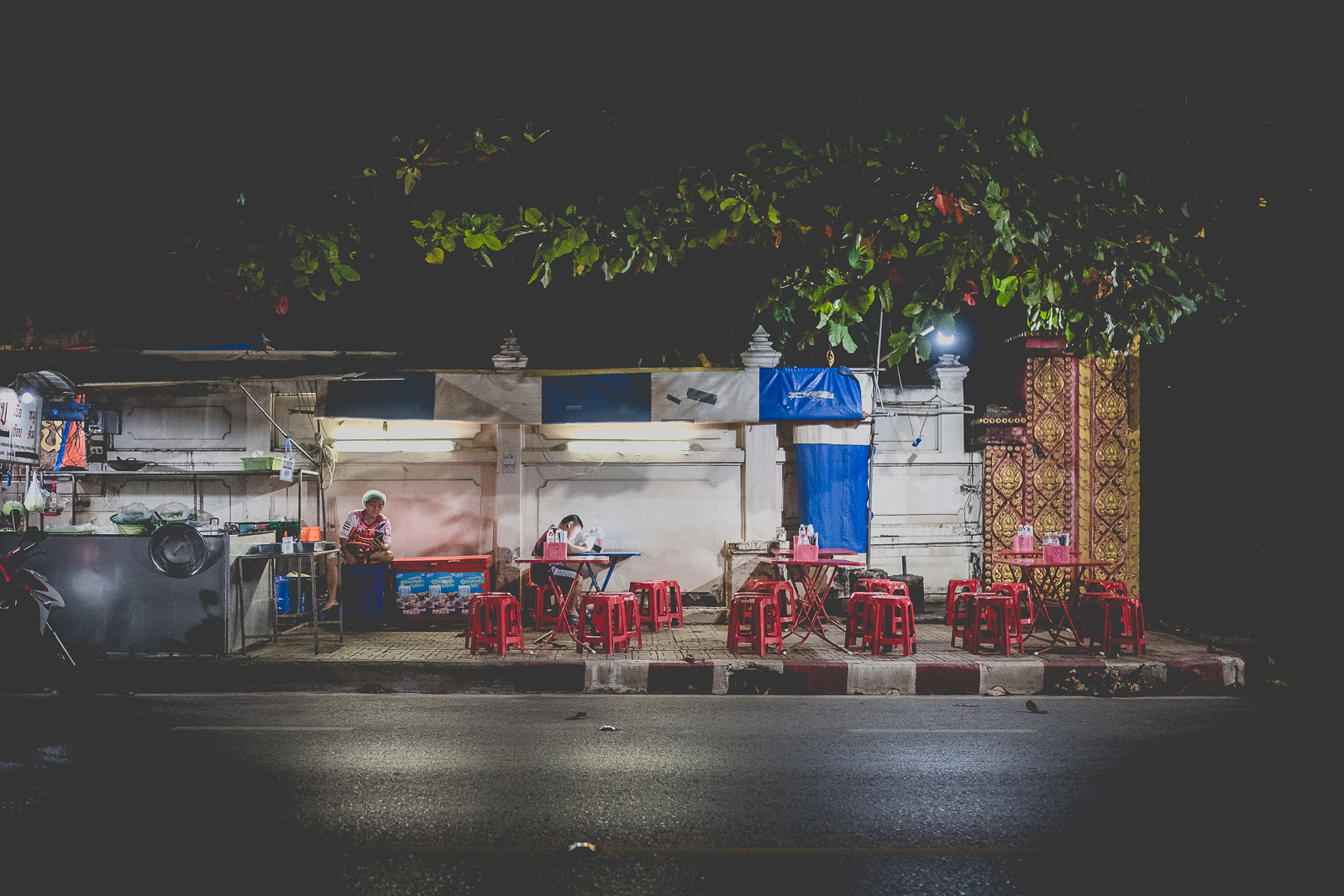 A Nong Khai – come in molti altri luoghi – ce ne sono molti. Cambiano già al mattino presto, insieme alla luce, a volte anche prima. Una baracca, un carretto. Montati nel silenzio. Un fornello, qualche sgabello di plastica colorata, così bassi che pare di tornare bambini. Forse è quel senso di non voler disturbare a volerli così bassi. Con le ginocchia in faccia.