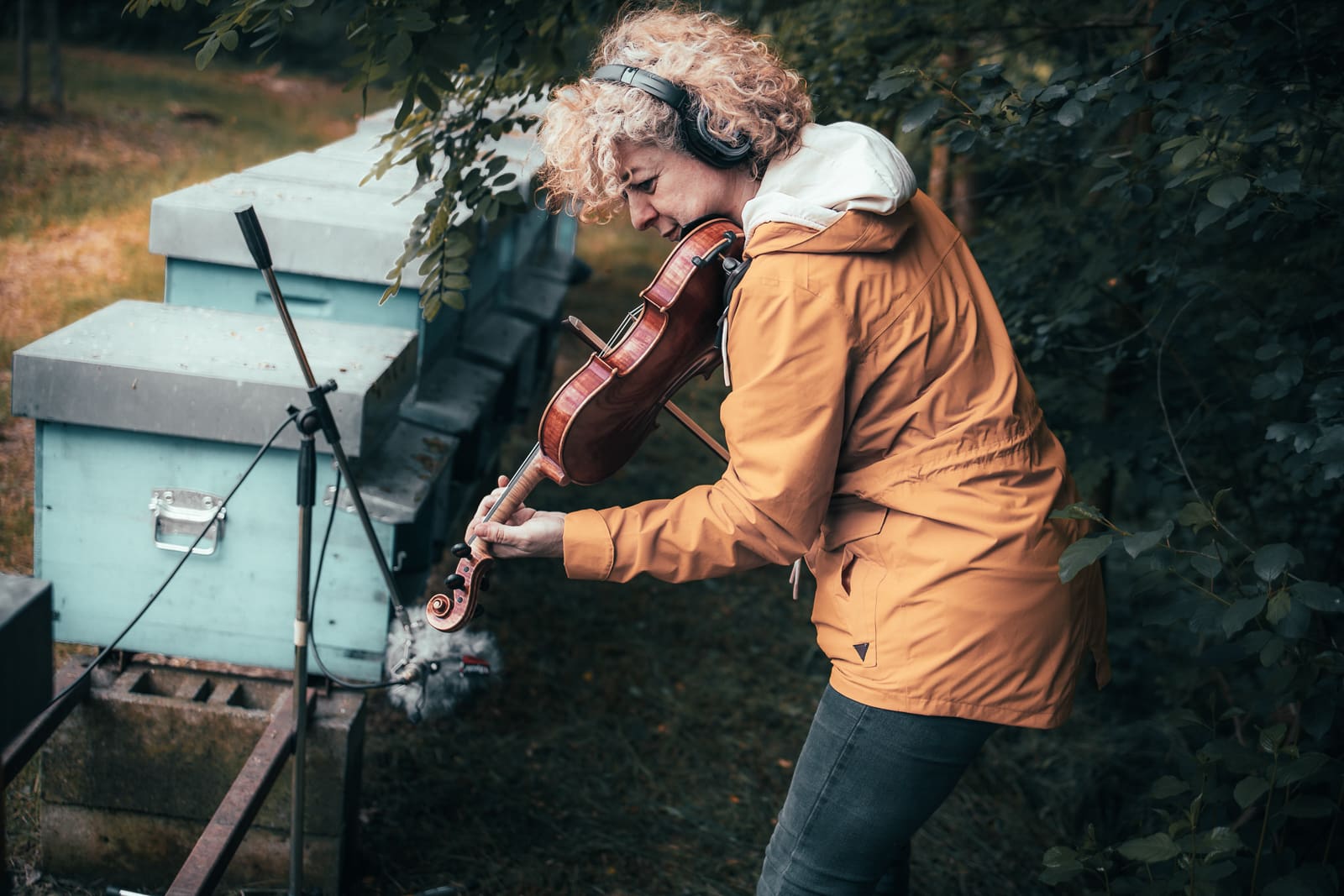 La svolta arriva grazie all’incontro con persone che hanno portato la musica… in apiario. Per Azzurra, la porta d’ingresso è l’amico sassofonista Vittorio Catalano, che aveva deciso di dedicarsi anche all’apicoltura. Azzurra inizia a seguirlo in apiario, imparando, osservando, registrando tutto con il suo registratore portatile. Già allora stava raccogliendo archivi sonori, geofonie, biofonie e antrofonie.